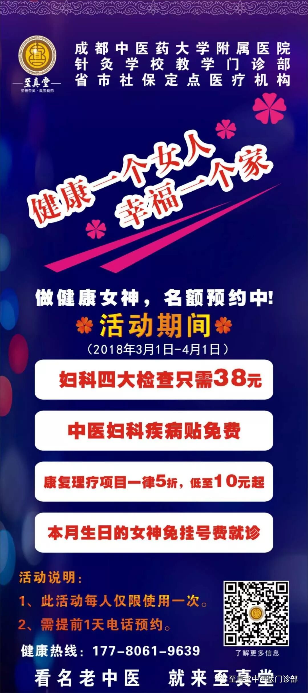 为迎接“三八”国际劳动妇女节的到来,成都中医药大学附院针灸学校至真堂教学门诊借助这个特殊的节日,为答谢成都百姓一直以来的信任和支持,我们有责任更有实力呵护起百姓的健康。为此,特向全市人民奉献一场“健康一个女人,幸福一个家”的主题活动,让群众得到实实在在的优惠,真真正正做到让百姓看得起病、看得好病的百姓放心中医馆。
